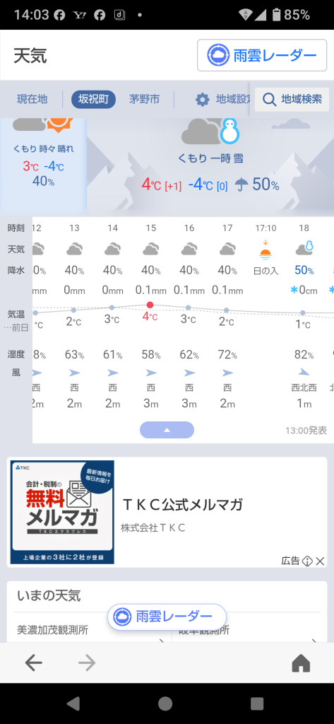 又、今確認の天気予報では、明日の雪は午後6時から50%の降雪確立の様です。